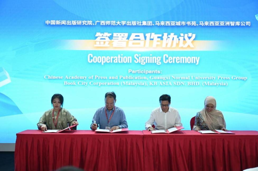 启动仪式现场,中国新闻出版研究院、广西师范大学出版社集团、马来西亚城市书苑、马来西亚亚洲智库有限公司现场签署合作协议,并为中国—东盟知识服务内容提供出版社代表颁发证书仪式。