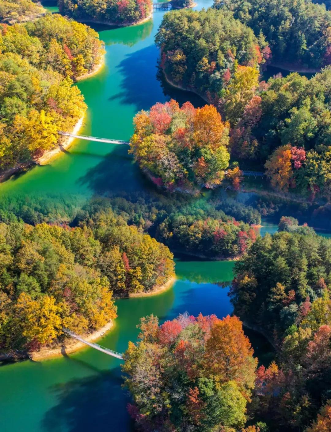 位于千汾线旁,秋季漫山枫叶变红,与湛蓝湖水、翠绿青山形成鲜明对比,湾内设有观景台,可停下欣赏 “三色交织” 的绝美风光;